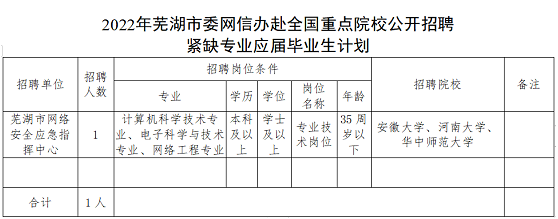 2022年蕪湖市委網(wǎng)信辦赴全國重點院校公開招聘緊缺專業(yè)應(yīng)屆畢業(yè)生工作方案