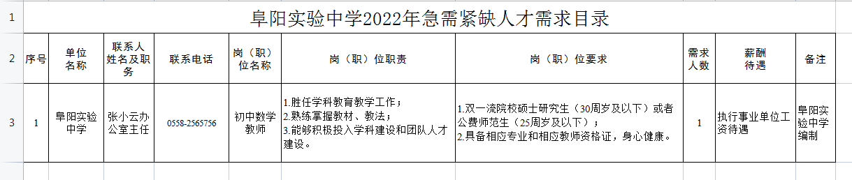 阜陽實驗中學(xué):初中數(shù)學(xué)教師1人,阜陽實驗中學(xué)編制,全職,執(zhí)行事業(yè)單位工資待遇。