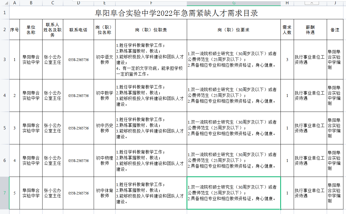 阜陽阜合實驗中學(xué):初中語文教師3人,數(shù)學(xué)教師1人,物理教師1人,歷史教師1人,體育教師1人,阜陽阜合實驗中學(xué)編制,全職,執(zhí)行事業(yè)單位工資待遇。