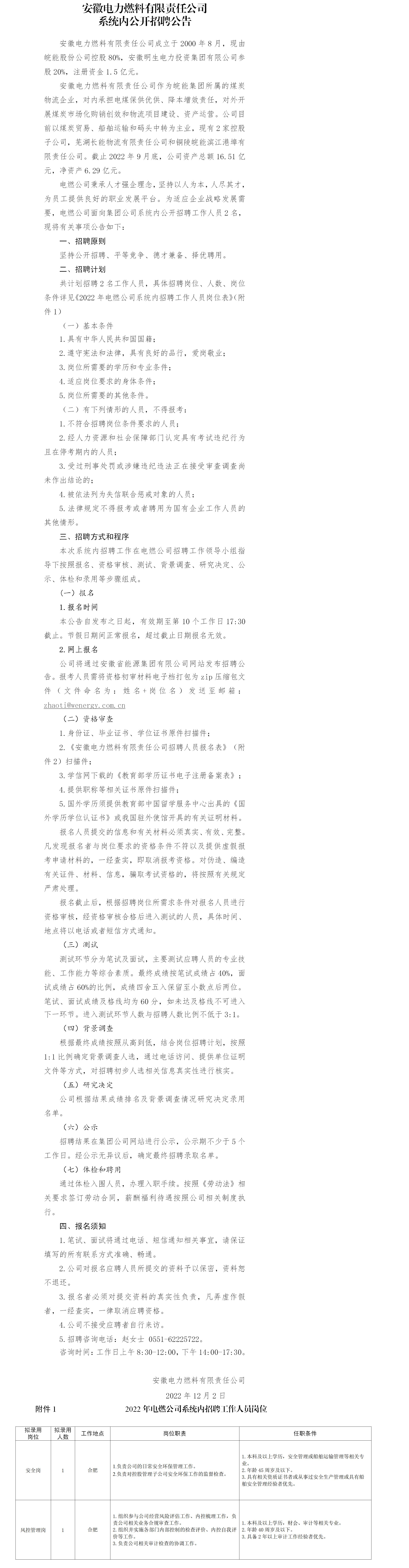 2022年安徽電力燃料有限責任公司系統(tǒng)內公開招聘公告