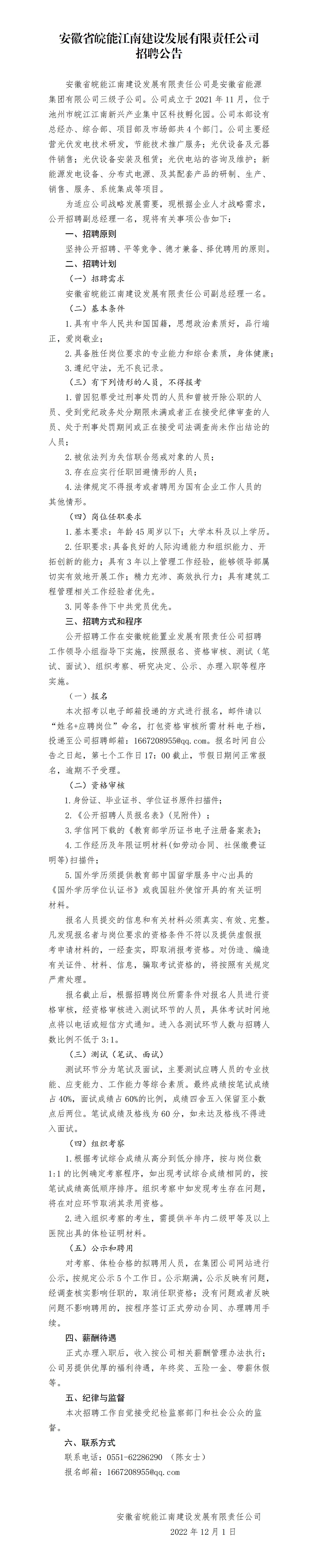 安徽省皖能江南建設發(fā)展有限責任公司副總經理一名。