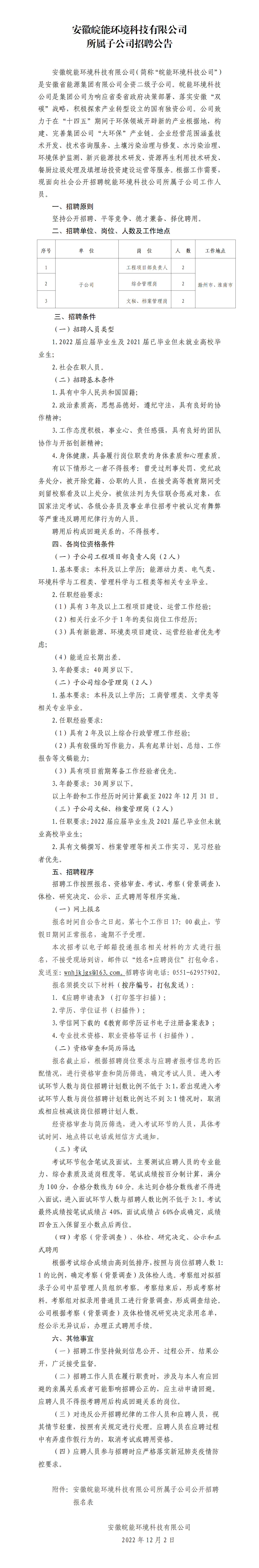 2022年安徽皖能環(huán)境科技有限公司所屬子公司招聘公告