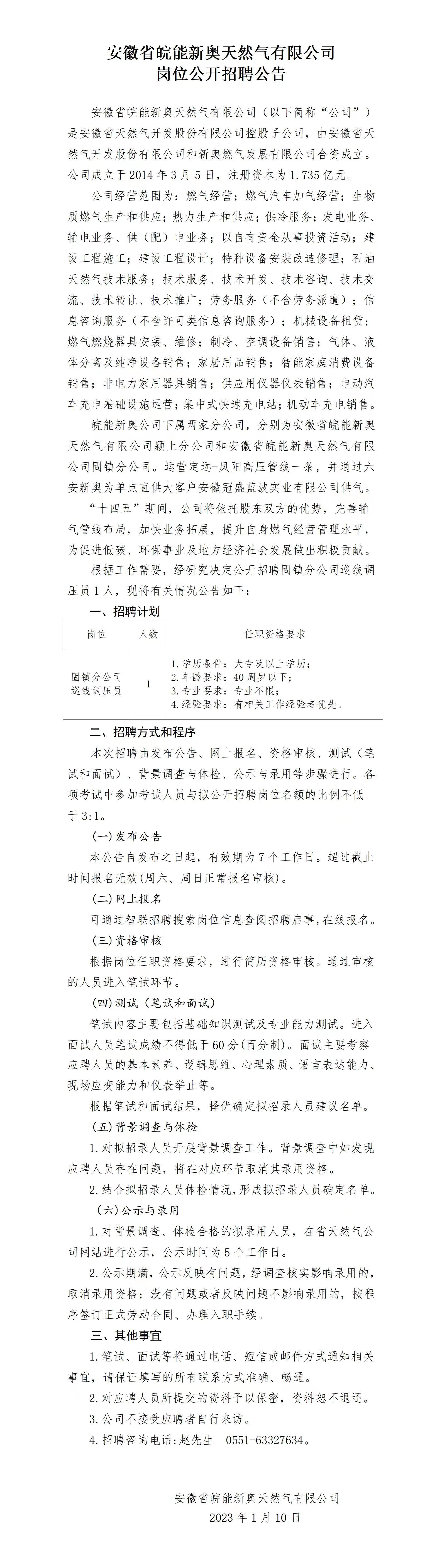 2023年安徽省皖能新奧天然氣有限公司崗位公開(kāi)招聘公告