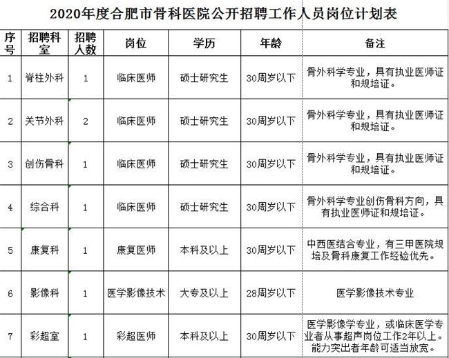 合肥市骨科醫(yī)院公開招聘10位工作人員,具體崗位及條件見《2020年度合肥市骨科醫(yī)院公開招聘工作人員崗位計(jì)劃表》(附件)