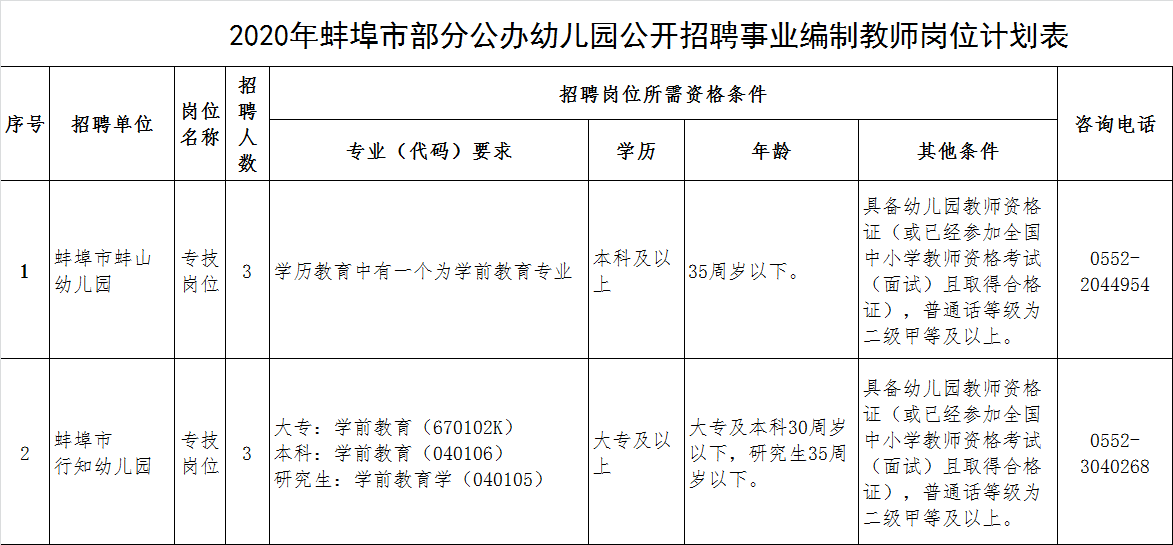 附件:《2020年蚌埠市部分公辦幼兒園公開招聘事業(yè)編制教師崗位計劃表》。