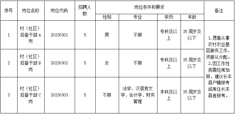 2023-03-07 22:54:15閱讀()長豐縣人民政府為提高農(nóng)村基層黨組織領(lǐng)導能力和治理水平,夯實基層基礎,為村級培養(yǎng)和儲備德才兼?zhèn)涞暮髠淙瞬拧=?jīng)研究,長豐縣崗集鎮(zhèn)人民政府決定面向社會公開招聘村(社區(qū))后備干部15名。現(xiàn)將有關(guān)事項公告如下: