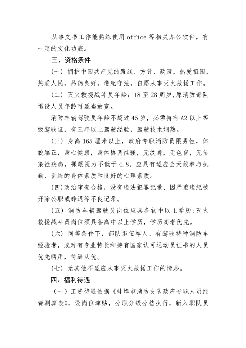 (六) 同等條件下,部隊退伍軍人、有駕駛特種消防車經(jīng)驗者,或?qū)τ袑I(yè)特長和持有國家認可運動員證書的人員優(yōu)先聘用,待遇從優(yōu)。