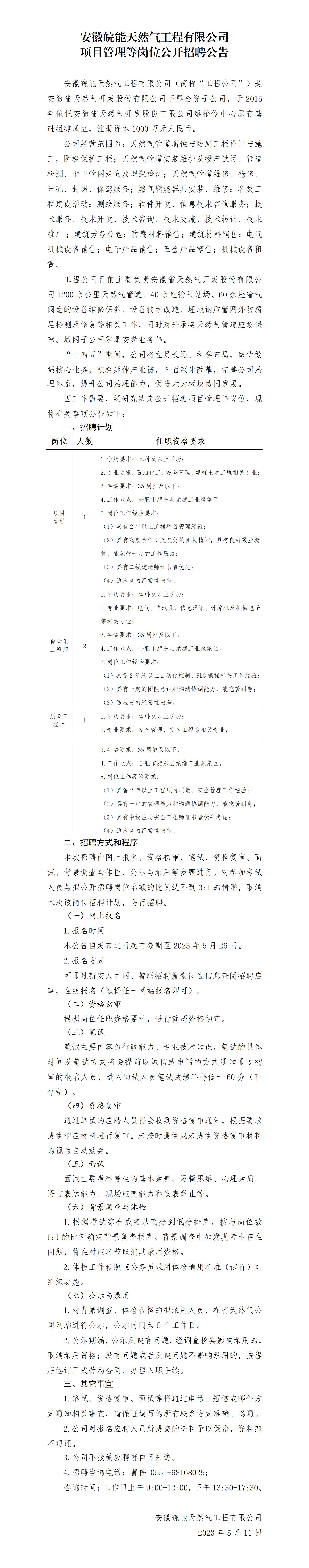 2023年安徽皖能天然氣工程有限公司項目管理等崗位公開招聘公告