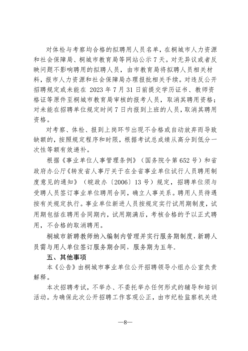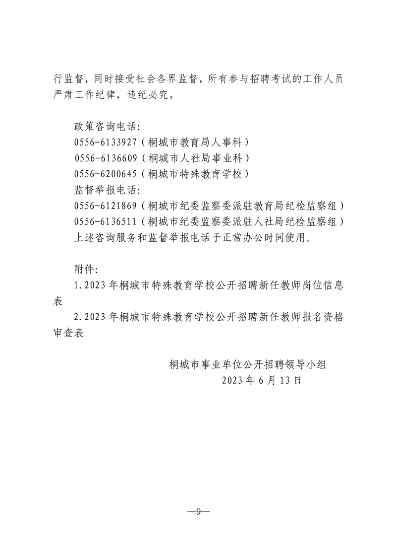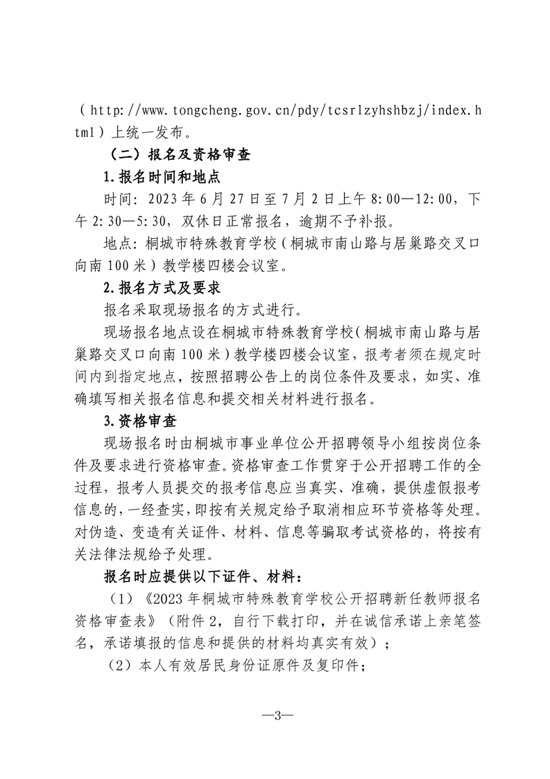 2023-06-13 17:44:37閱讀()桐城市人民政府根據(jù)《事業(yè)單位人事管理條例》(國務(wù)院令第652號)、《安徽省事業(yè)單位公開招聘人員暫行辦法》(皖人社發(fā)〔2010〕 78號) 、《安徽省教育廳安徽省委編辦安徽省財政廳安徽省人力資源和社會保障廳關(guān)于進一步完善中小學(xué)教師招聘制度落實市縣中小學(xué)教師招聘主體責(zé)任的通知》(皖教秘師〔2020390號)等規(guī)定和要求,現(xiàn)就2023年桐城市特殊教育學(xué)校公開招聘新任教師工作有關(guān)事項公告如下: