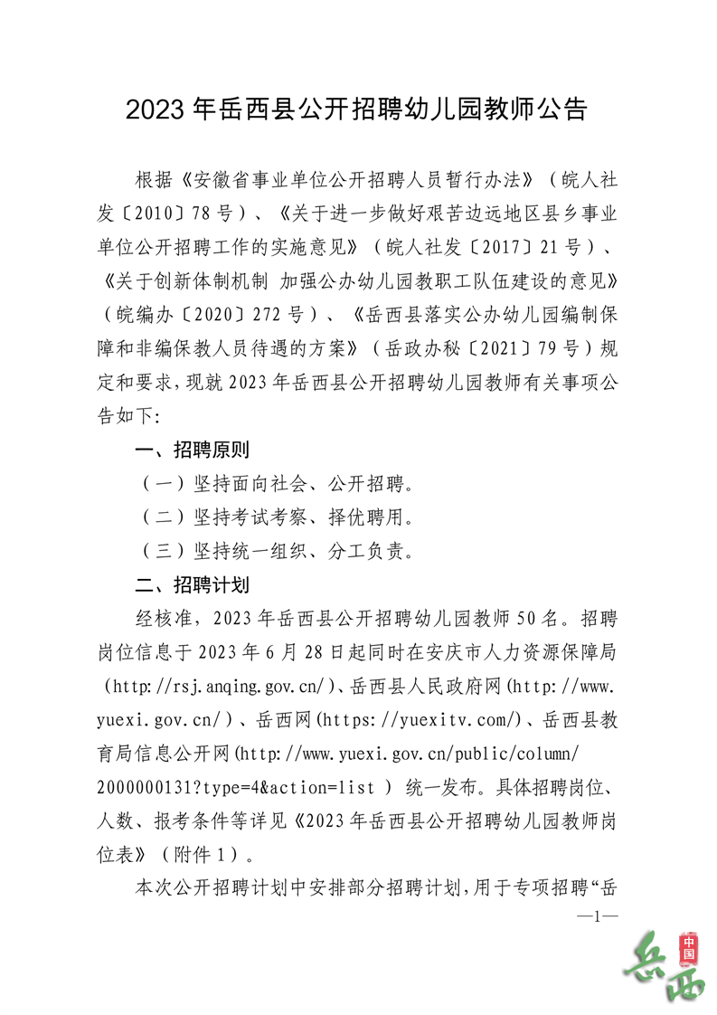 經(jīng)核準,2023年岳西縣公開招聘幼兒園教師50名。招聘崗位信息于2023年6月28日起同時在安慶市人力資源保障局