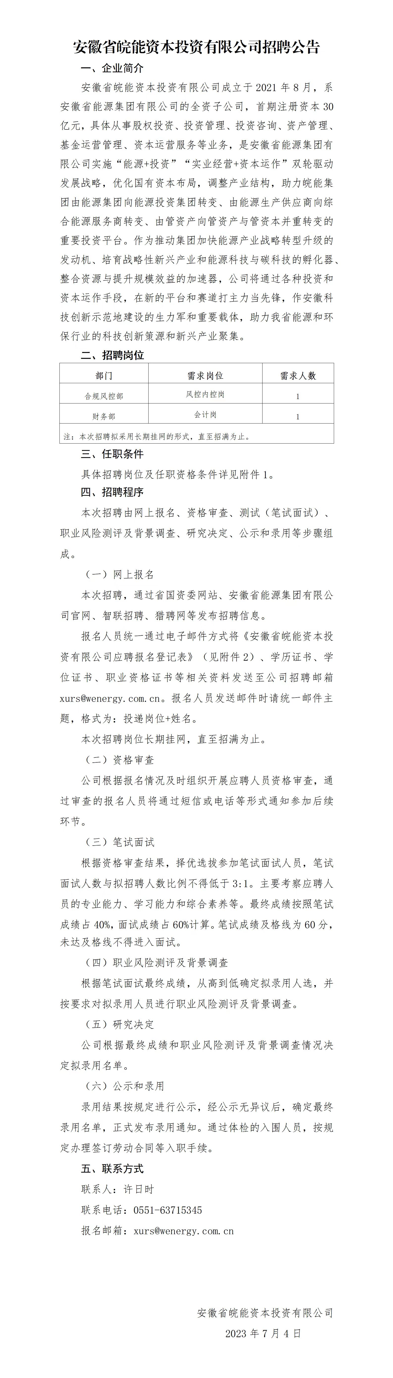 2023年安徽省皖能資本投資有限公司招聘公告