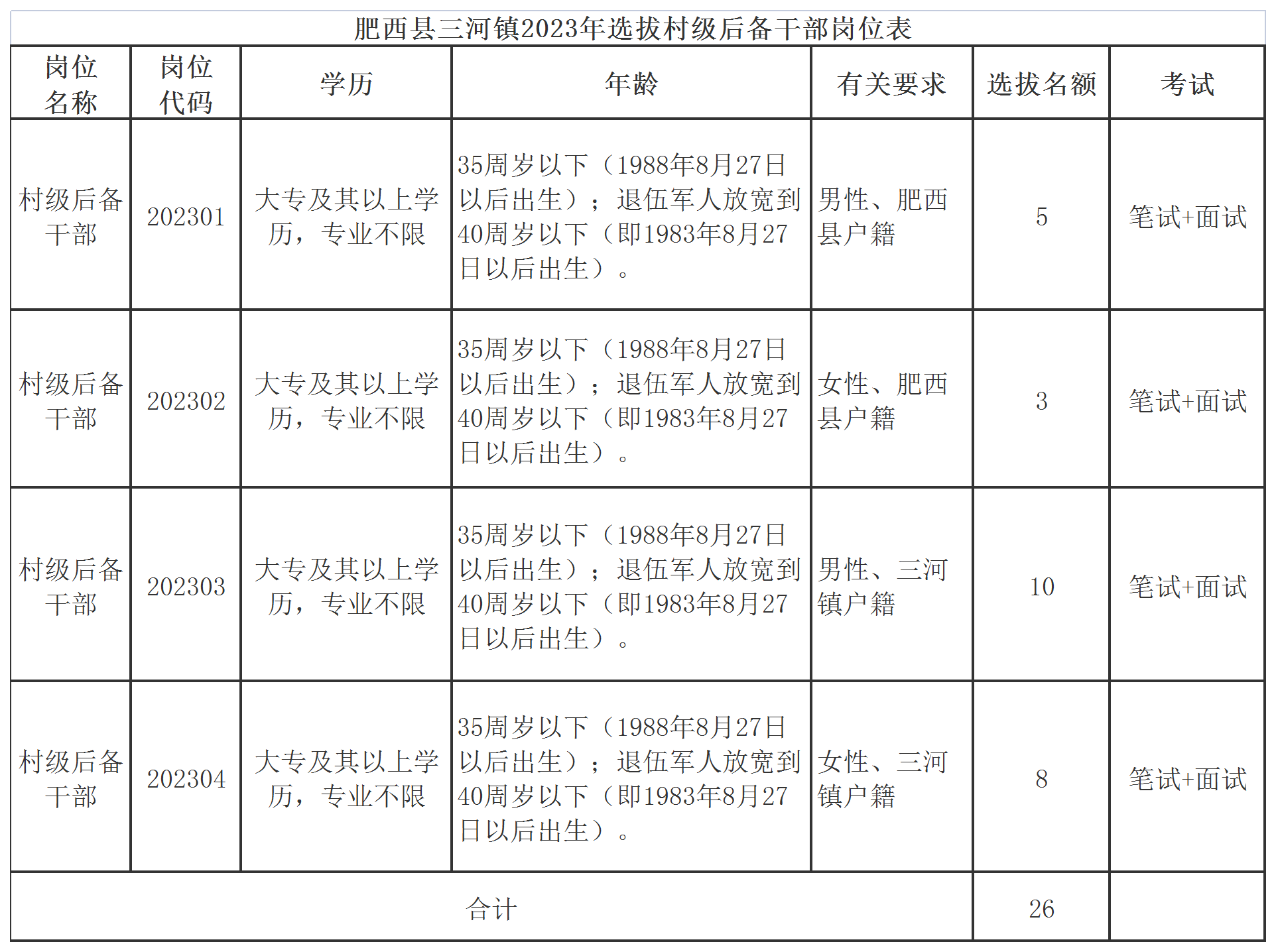 計(jì)劃選拔26名村級(jí)后備干部,其中肥西縣戶籍8名,三河鎮(zhèn)戶籍18名。詳見附表。