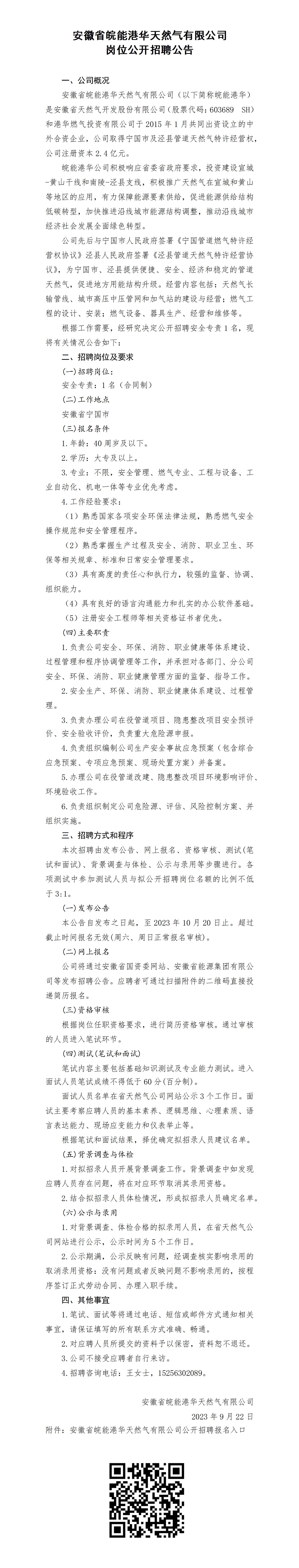2023年安徽省皖能港華天然氣有限公司崗位公開(kāi)招聘公告(二)