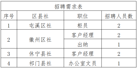 二、 招聘崗位及工作地點(diǎn):柜員2人、客戶經(jīng)理4人、出納1人、辦公室文員1人(具體見下表),黃山市范圍內(nèi),遵循屬地原則。