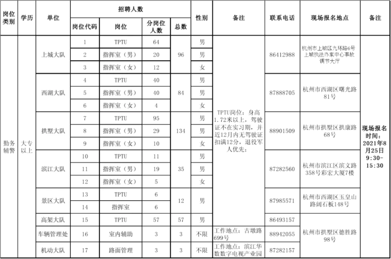 2021年杭州市公安局市局機(jī)關(guān)警務(wù)輔助人員(交通管理輔警)招聘公告